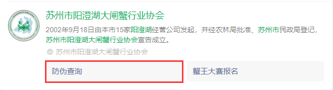 对于阳澄湖大闸蟹的真伪,消费者可通过“苏州市阳澄湖大闸蟹行业协会”微信公众号中的“防伪查询”,进入溯源防伪验证。