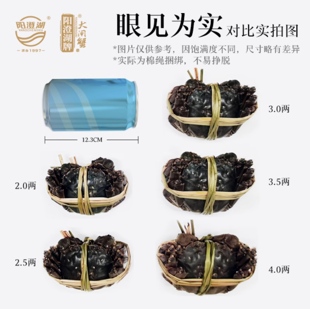 关于价格,《消费者报道》从阳澄湖食品旗舰店获悉,该店铺销量较高的一款阳澄湖牌原产地大闸蟹礼盒(2.5两母蟹×8只)目前售价为598元,平均每只的价格约为75元。从商家宣传页面可看到,2.5两在大闸蟹中属于中小规格。该店铺售卖的阳澄湖大闸蟹据称拥有三重防伪保障,包括阳澄湖大闸蟹防伪(湖区养殖)、公司防伪、质量追溯体系防伪。