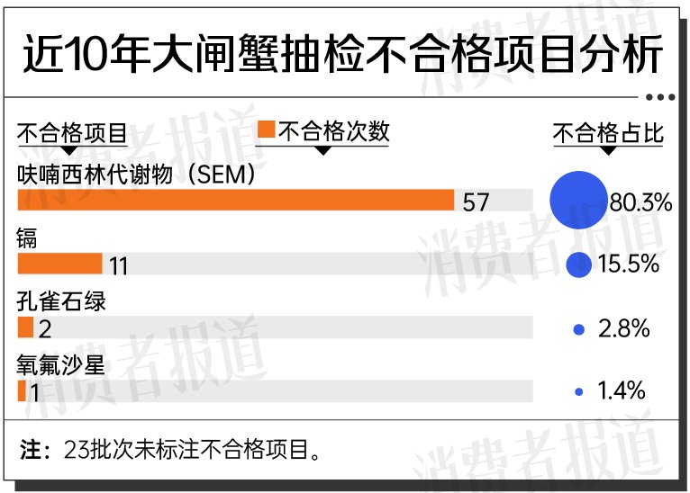 结果显示,国家市场监督管理总局近10年抽检发现不合格大闸蟹94批次,不合格原因涉及抗生素药物残留、重金属超标。