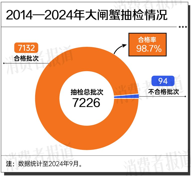 然而,在享受美食的同时,食品安全问题不容忽视。2024年9月,《消费者报道》整理了国家市场监督管理总局于2014年至2024年发布的关于大闸蟹的质量抽检情况。